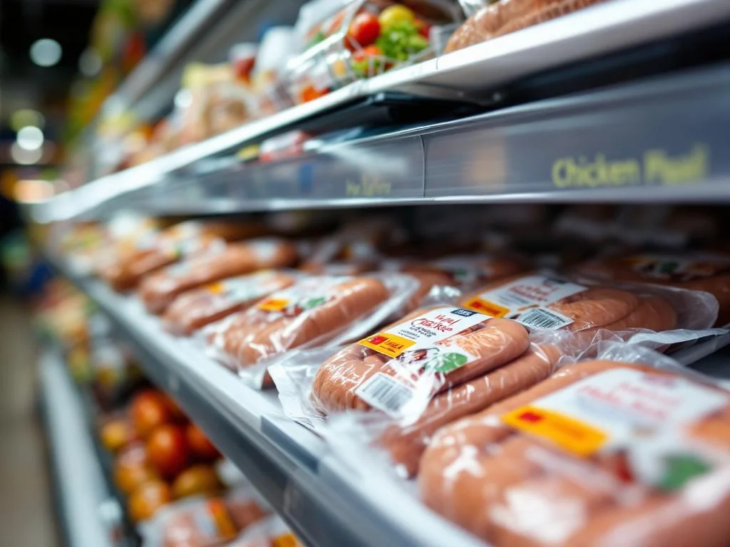 Des produits alimentaires courants, tels que des saucisses de poulet grillées, des hot-dogs, des salades…